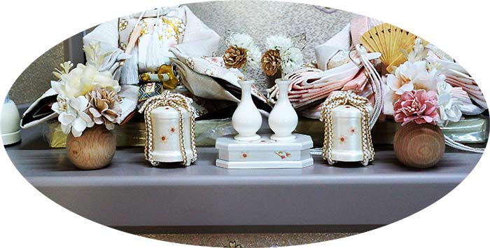 プリンセス雛人形にふさわしいおひな道具がセットされています