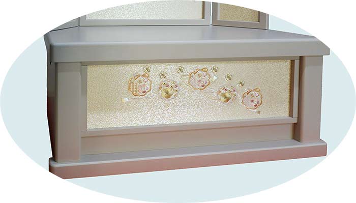 屏風と収納箱は刺繍仕上げの美しいデザインです。
