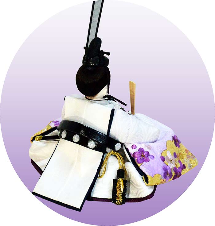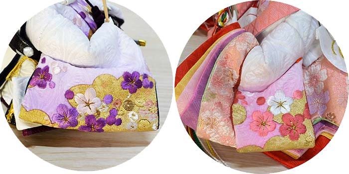 美しい紫刺繍仕立てのお揃い柄の衣裳です。女雛の衣裳も男雛とお揃いの刺繍仕立てです。