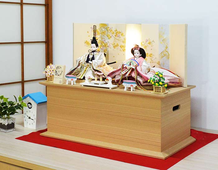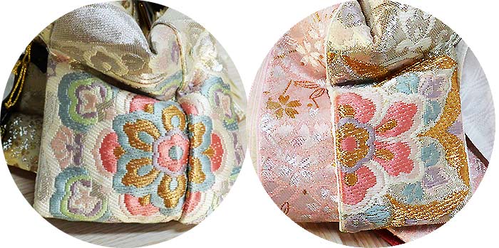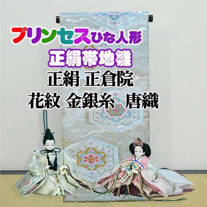 | 品名 | 正絹帯地のプリンセス雛人形 絹衣雛 正倉院柄 唐織金銀糸 華紋(しょうそういんがら からおり きんぎんいと はなもん) かすみ収納セット<33-6703-707-1> |
