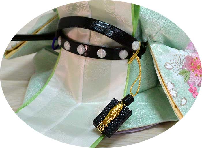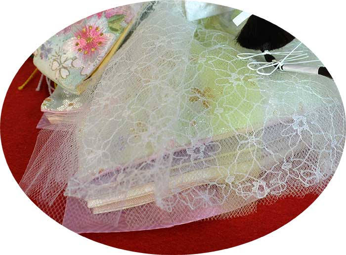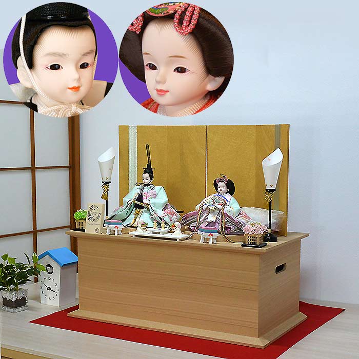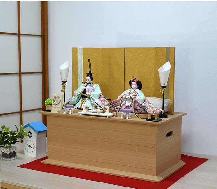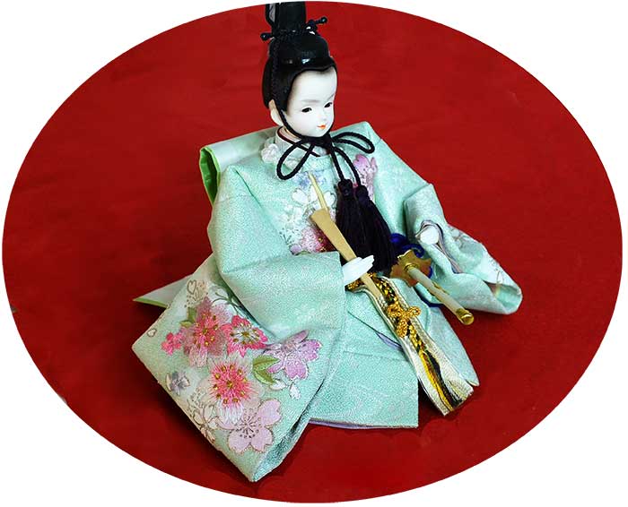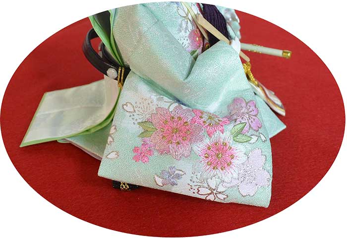 ターコイズブルーの刺繍が美しい、上品なデザインのプリンセス雛人形の収納セット。