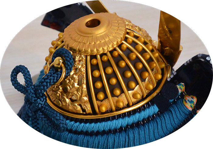 ◆日本の伝統食出る縹色(はなだいろ)と呼ばれる、中間色のブルー系の高級正絹糸を使用した兜。